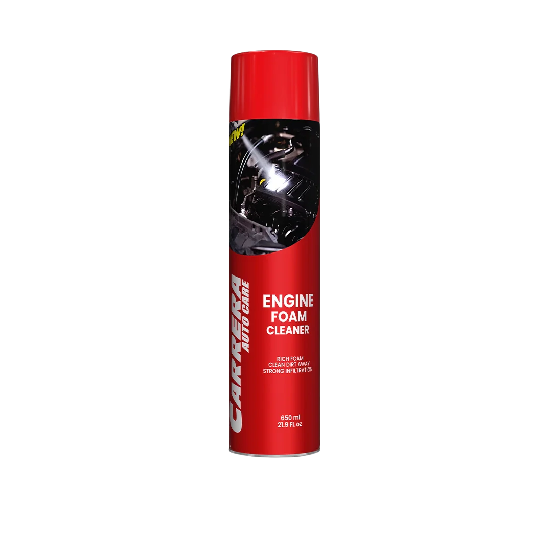 Carrera Engine Foam Cleaner (650 ml) is a clinging aerosol that expands into tight areas, lifting oil, grease, and road grime from the engine bay. It wipes or rinses away clean, leaving parts ready for inspection or dressing.