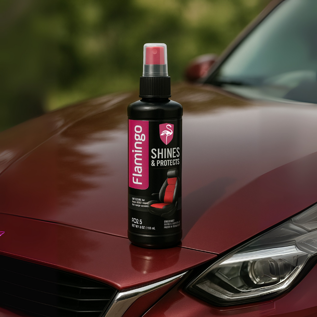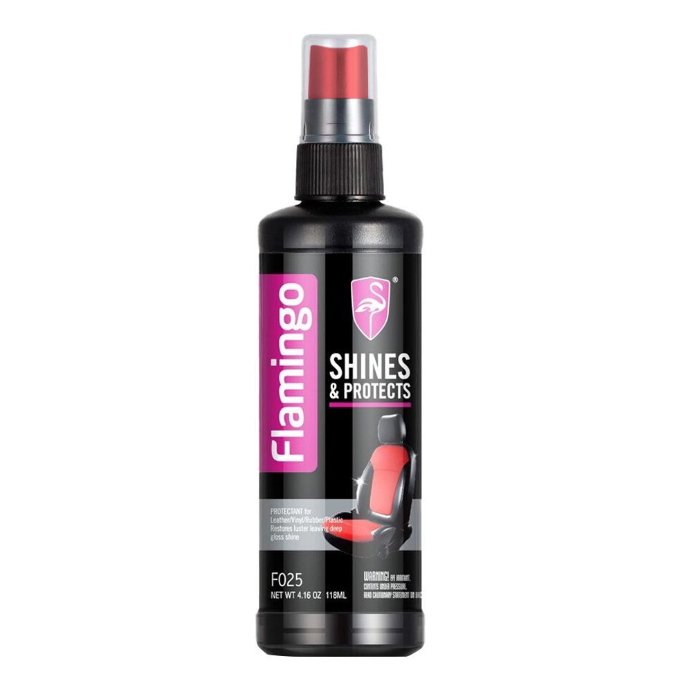Flamingo Shines & Protects Multi-Purpose Shine Spray is an all-in-one interior protectant specially formulated to restore shine and provide long-lasting protection to leather, vinyl, rubber, and plastic surfaces. It rejuvenates dull interiors while acting as a shield against fading, cracking, and UV damage.