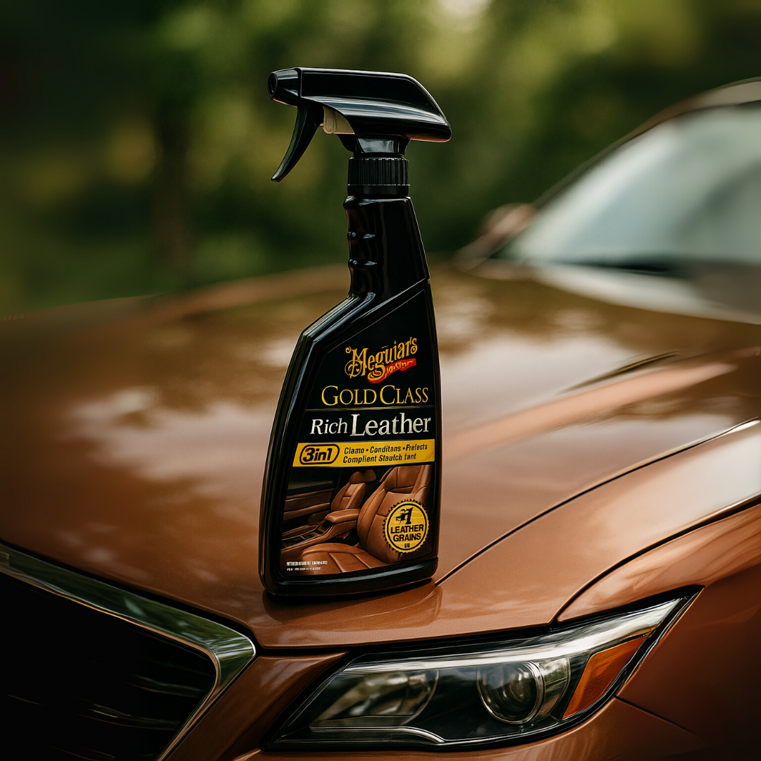 Meguiar's Gold Class Rich Leather Cleaner and Conditioner Spray is a premium formula that cleans, conditions, and protects leather surfaces in one easy application. It helps maintain the natural look and feel of leather while providing protection against drying and fading.