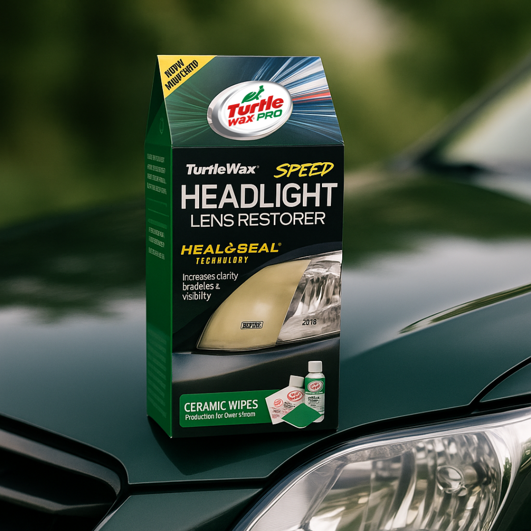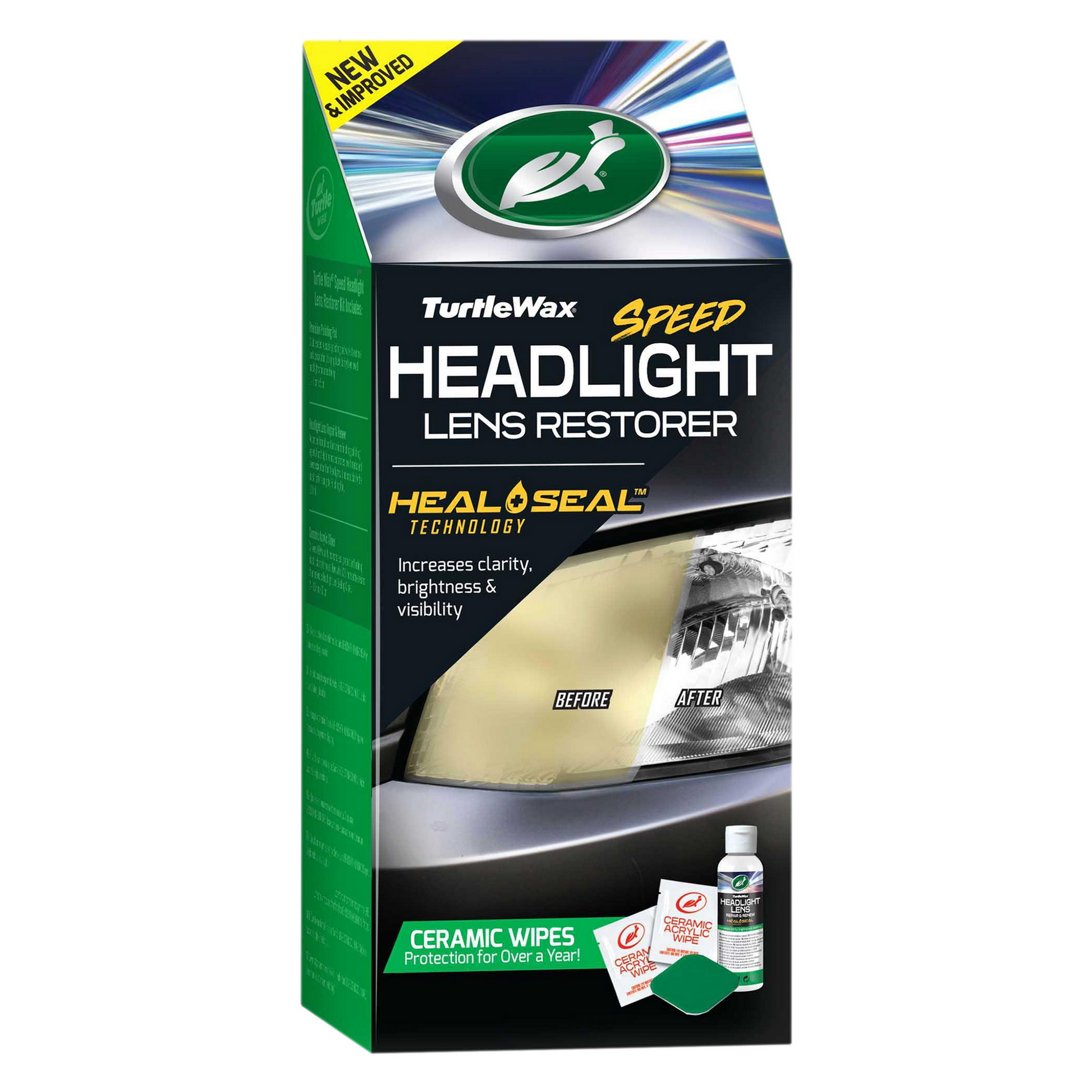 Turtle Wax Speed Headlight Lens Restorer is a complete kit designed to quickly restore clarity, brightness, and visibility to cloudy or yellowed headlights. It uses Heal & Seal technology and includes ceramic wipes for long-lasting protection.