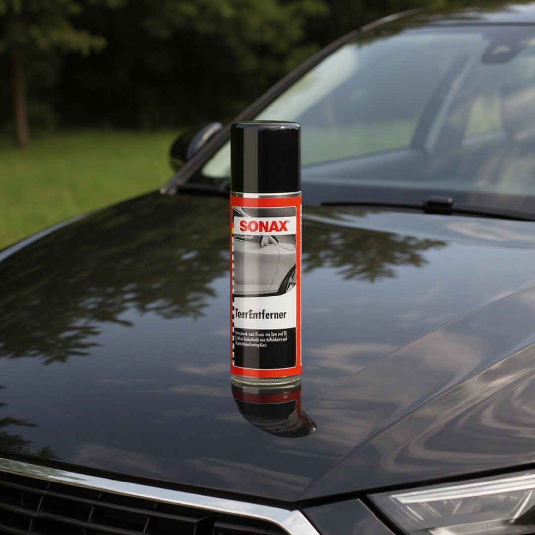 SONAX TeerEntferner is a powerful, fast-acting spray that dissolves tar, asphalt, oil, and adhesive residues from paint, chrome, and plastic surfaces without harming the vehicle’s finish.